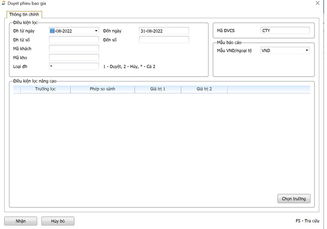 - Bước 2: Hệ thống sẽ hiển thị ra trang lọc chứng từ, bạn hãy điền đầy đủ các điều kiện lọc và bấm vào mục “Nhận” ở góc dưới bên phải.