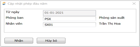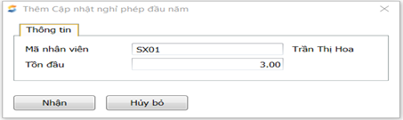 Nhập xong điều kiện lọc thì nhấn <<Nhận>>, vào cửa sổ thông tin phép đầu năm chọn <<Mới>> để thêm mới cho nhân viên.