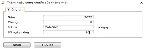 Click vào <<Mới>>. Sau đó nhập tham số “Năm – tháng - mã ca - ngày công chuẩn”. Sau đó ấn <<Nhận>>.