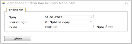 - Loại ca nghỉ: Chọn loại ca nghỉ: 0- Nghỉ cả ngày; 1- nghỉ sáng; 2- nghỉ chiều; 3- nghỉ tối