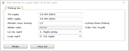 - Lý do nghỉ: Nếu lý do là NGHIPHEP thì ngày nghỉ đó sẽ bị cắt phép, vẫn được tính lương và tổng ngày nghỉ phép (bằng số ngày nghỉ phép định mức trong năm cộng với số ngày nghỉ phép đầu năm) sẽ giảm đi tương ứng với loại nghỉ. Nếu lý do là NGHIBU – nghỉ bù => thì ngày nghỉ đó vẫn được tính lương. Còn nghỉ khác và nghỉ việc riêng sẽ bị trừ lương tương ứng với thời gian nghỉ trong khai báo loại nghỉ.