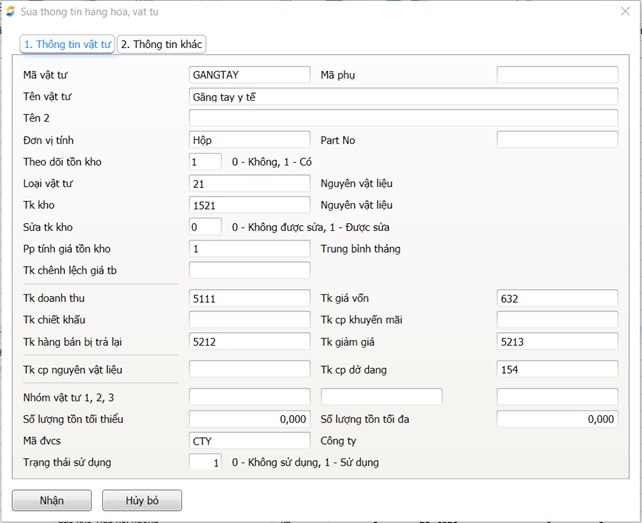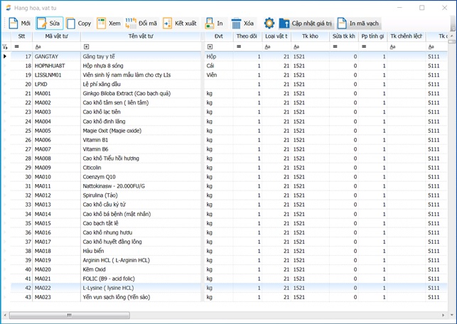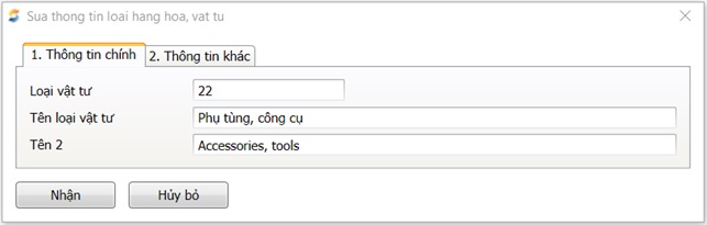 - Click chuột vào loại vật tư hàng hóa muốn sửa