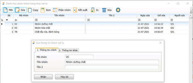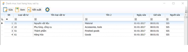 SIS ERPSME đã thiết lập sẵn một số loại vật tư, hàng hóa phục vụ cho việc quản lý vật tư hàng hóa của doanh nghiệp. Kế toán có thể sửa đổi sao cho phù hợp với nhu cầu thực tế tại doanh nghiệp.