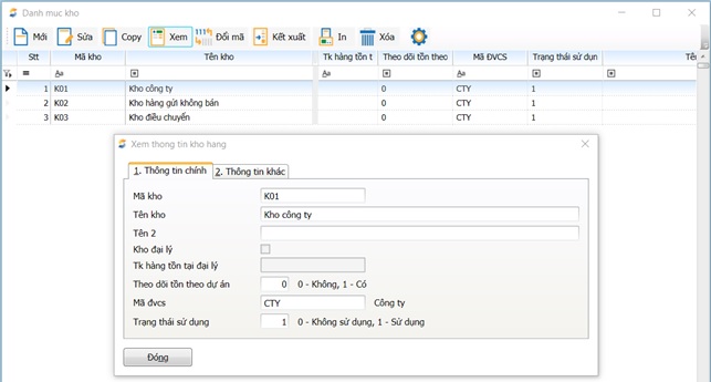 Đường dẫn: Quản lý tồn kho\Danh mục từ điển\ danh mục kho