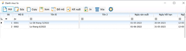 Đường dẫn: Quản lý tồn kho\ danh mục từ điển\ Danh mục lô.