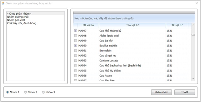 Chức năng: Hàng hóa, vật tư có tính chất, đặc điểm tương đồng sẽ được phân vào một nhóm. Việc phân nhóm hàng hóa, vật tư giúp cho lọc dữ liệu và lên báo cáo thống kê, phân tích theo nhóm.