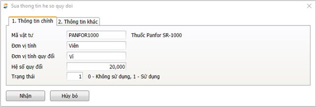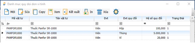 Ví dụ: Nhập đơn vị tính quy đổi của vật tư PANFOR1000 đã khai báo đơn vị tính trong danh mục hàng hóa vật tư là “Viên” như sau: