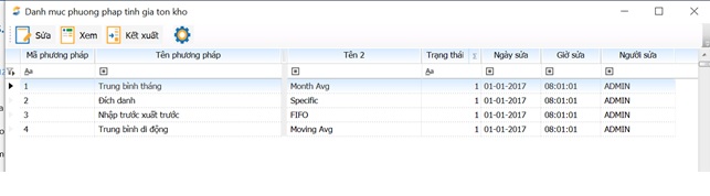 Chức năng: khai báo danh mục phương pháp tính giá tồn kho