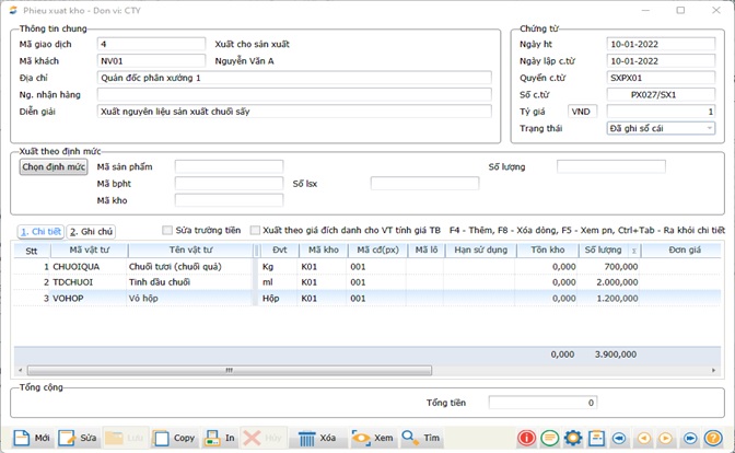 Chức năng: Dùng để xuất kho nguyên vật liệu, bán thành phẩm để sản xuất. Đối với thành phẩm và bán thành phẩm có định mức sản xuất thì sau khi nhập kho thành phẩm, trên phiếu nhập kho có ô người dùng chỉ cần kích vào thì phần mềm sẽ tự động xuất phiếu NVL theo định mức đã được khai báo sẵn. Người dùng chỉ cần kiểm tra lại phiếu xuất kho NVL và lưu lại