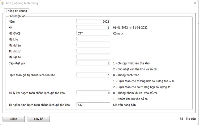 - Chọn năm, chọn kỳ tính giá cho tháng mấy, chọn mã ĐVCS cần tính giá.