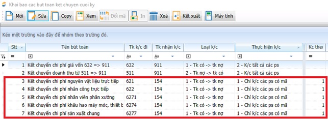 - Bước 4: Kết chuyển chi phí 621,622, 627 sang chi phí sản xuất kinh doanh dở dang – 154