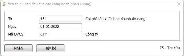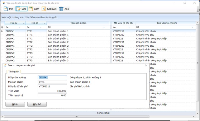- Đường dẫn: Chi phí, giá thành\Giá thành giản đơn\Số dư đầu\Vào số dư ban đầu của các phân xưởng