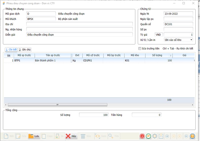 Chức năng: Phiếu điều chuyển công đoạn nhằm đáp ứng những trường hợp bán thành phẩm không qua nhập xuất kho mà được đưa trực tiếp qua công đoạn sau