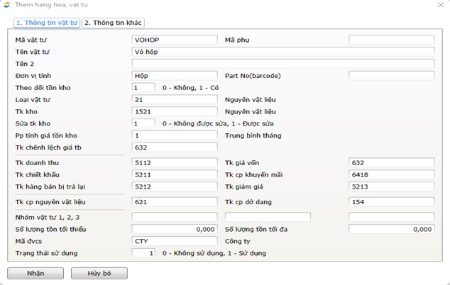 Lưu ý: Phải chọn Loại vật tư: 21-Nguyên vật liệu; Tài khoản kho: 152 – Nguyên vật liệu (tuỳ nhu cầu quản lý có thể để tài khoản chi tiết của 152); Tài khoản chi phí nguyên vật liệu: 621 (Để khi xuất kho NVL sản xuất, phần mềm tự hạch toán chi phí NVL vào TK:621); chọn phương pháp tính giá tồn kho mà doanh nghiệp đang sử dụng và chọn mã ĐVCS nếu như hạch toán riêng cho từng ĐVCS