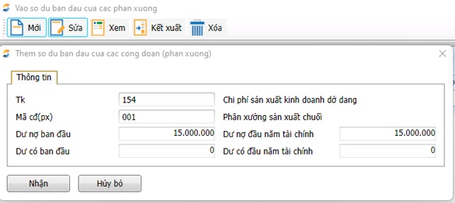 - “Thêm mới” số dư đầu sau đó khai báo các thông tin: Tài khoản theo dõi sản phẩm dở dang (154), mã cđ (Px) – để tập hợp chi phí theo phân xưởng, Dư nợ ban đầu: 15.000.000 VNĐ