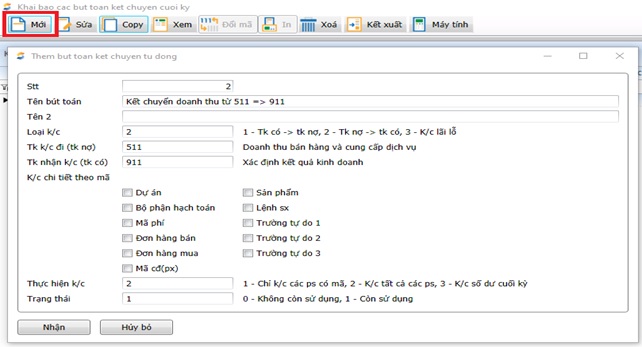 Chức năng: Cho phép thực hiện kết chuyển doanh thu, chi phí, thuế giá trị gia tăng cuối kỳ: