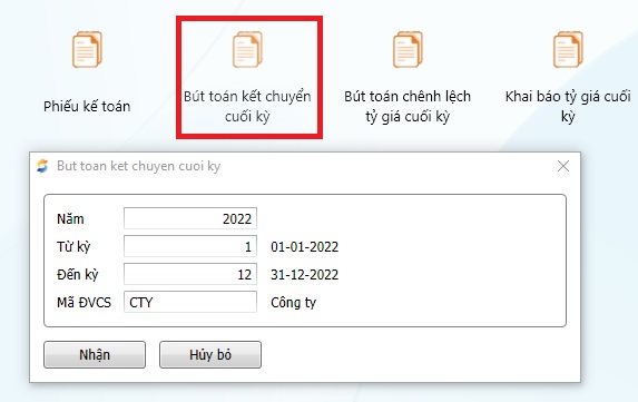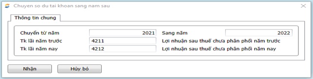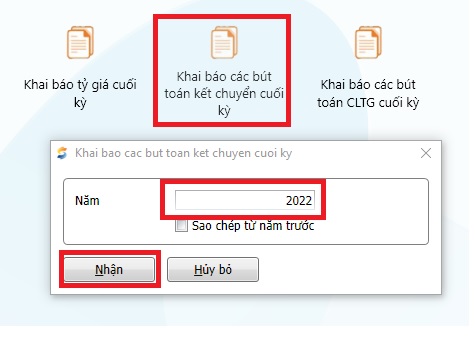 - Chọn năm kết chuyển sau đó nhấn “Nhận” để vào cửa sổ khai báo bút toán kết chuyển
