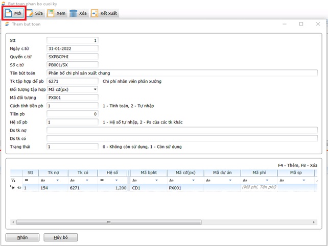 2. Nhấn nút <<Mới>> để tạo bút toán phân bổ