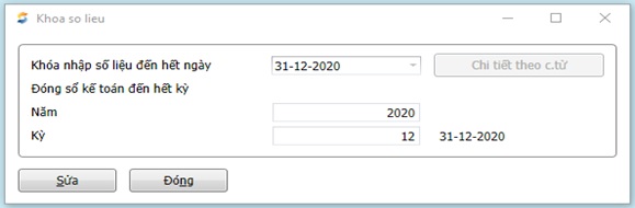 Chức năng: Chương trình có chức năng khóa dữ liệu khi đã nhập liệu và hoàn tất chứng từ cho một kỳ báo cáo. Kể từ ngày khóa số liệu trở về trước, không thể chỉnh sửa hoặc thêm mới bất kỳ chứng từ nào. Nếu buộc phải hiệu chỉnh số liệu một kỳ đã khóa, phải “Mở” bằng cách khóa với ngày của kỳ trước đó.