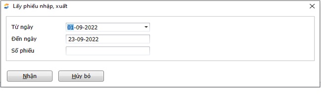 - Chọn phiếu nhập: Tích vào chức năng chọn phiếu nhập, chương trình hiển thị màn hình lấy phiếu nhập như hình dưới
