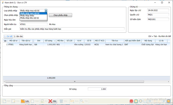 - Chức năng này cho phép người dùng nhập liệu kết quả kiểm định chất lượng hàng hóa đầu vào, nhập mua hoặc nhập kho thành phẩm.