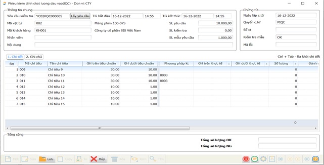 Đường dẫn: Quản lý chất lượng/ Cập nhập dữ liệu/ phiếu kiểm định chất lượng đầu vào (IQC).