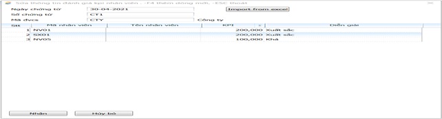 Cập nhật đánh giá KPI cho nhân viên với mức tiền nhập trong cột KPI. Số tiền này sẽ được cộng vào cột “Tổng cộng” trên bảng lương chi tiết nhân viên.