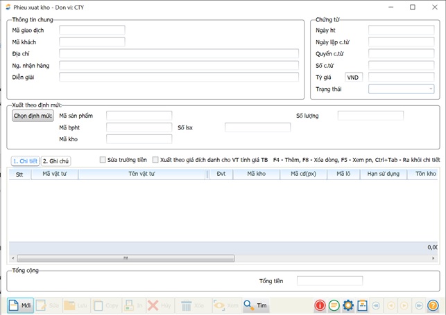 - Chức năng: Phiếu xuất kho dùng để lập các phiếu xuất nguyên vật liệu dùng trong sản xuất, xuất công cụ dụng cụ trong sử dụng nội bộ và xuất khác.