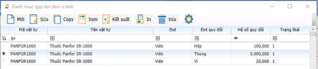 Ví dụ: Nhập đơn vị tính quy đổi của vật tư PANFOR1000 đã khai báo đơn vị tính trong danh mục hàng hóa vật tư là “Viên” như sau: