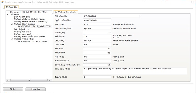 - Tuyển dụng: Sau khi tuyển dụng ứng viên được chấp nhận thì đổi giá trị là “1”, nếu bị loại thì giá trị là “0”