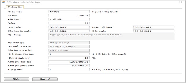 Đường dẫn: Nhân sự\ Tuyển dụng, đào tạo \ Các khóa đào tạo