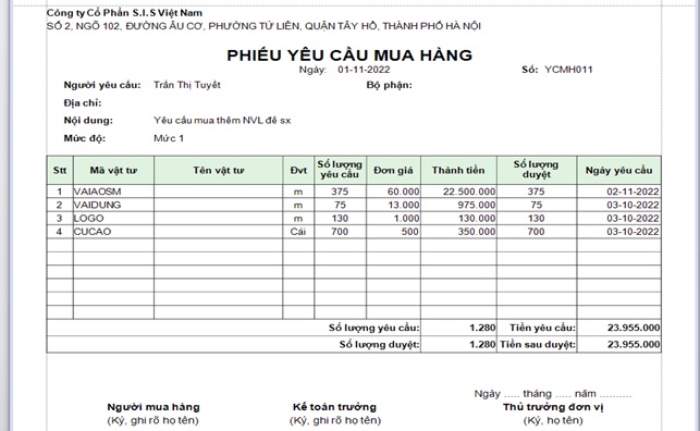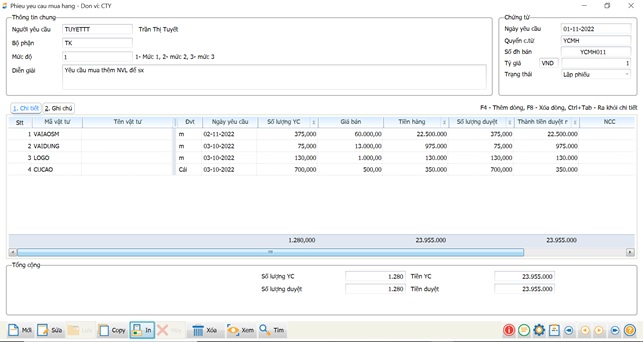 Chức năng: Khi phát sinh nhu cầu mua hàng bộ phận phụ trách lập phiếu yêu cầu mua hàng